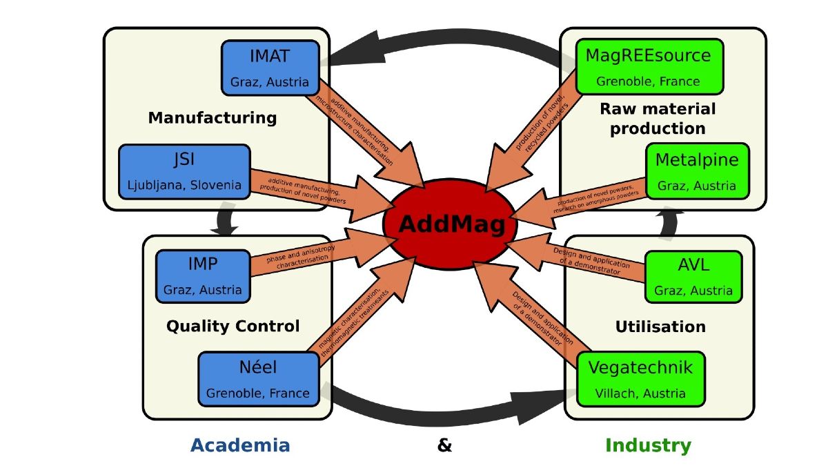 At the heart of the project was the ambition to replace conventional, inflexible manufacturing processes with AM, which enables near-net-shape production and reduces reliance on virgin rare earth materials. The powder production team lead by the French company MagREEsource achieved a major breakthrough by developing a closed-loop recycling process for Nd-Fe-B magnets, producing powder with ultra-low oxygen and hydrogen content (≤95 ppm O₂, < 5 ppm H) while preserving over 93% of the material's remanence. Here, AddMag delivered tangible industrial progress: MagREEsource scaled up its hydrogen-based recycling technology, positioning itself as a future supplier of high-quality recycled Nd-Fe-B powder, while Metalpine advanced its powder spheroidization process, enabling an up-cycling of recycled and non-spherical powders in AM.