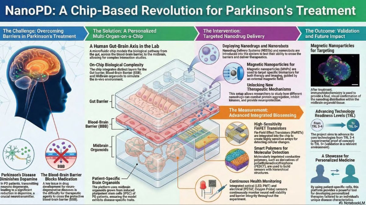 The nanoPD project focuses on modeling biological barriers in vitro using multi-compartment microfluidic chips containing human midbrain organoids to develop new theranostics for Parkinson's Disease (PD).