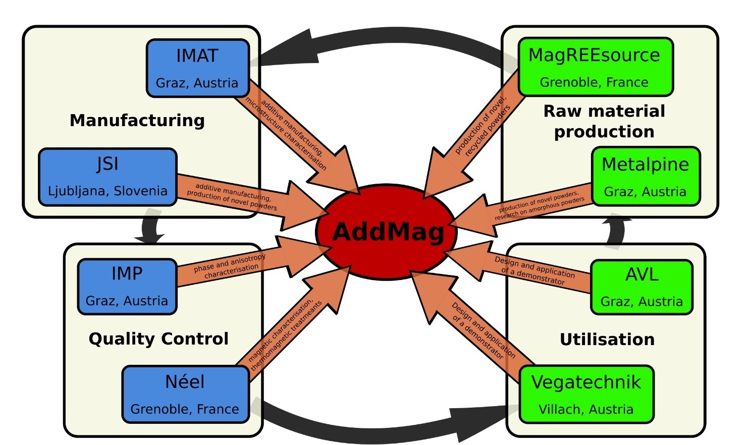 The AddMag project has successfully demonstrated that additive manufacturing (AM) can produce permanent magnets with exceptional magnetic performance, dimensional accuracy, and sustainability. At the heart of the project was the ambition to replace conventional, inflexible manufacturing processes with AM, which enables near-net-shape production and reduces reliance on virgin rare earth materials. The powder production team lead by the French company MagREEsource achieved a major breakthrough by developing a closed-loop recycling process for Nd-Fe-B magnets, producing powder with ultra-low oxygen and hydrogen content (≤95 ppm O₂, < 5 ppm H) while preserving over 93% of the material's remanence.Here, AddMag delivered tangible industrial progress: MagREEsource scaled up its hydrogen-based recycling technology, positioning itself as a future supplier of high-quality recycled Nd-Fe-B powder, while Metalpine advanced its powder spheroidization process, enabling an up-cycling of recycled and non-spherical powders in AM. This innovations not only minimize the environmental impact of magentic materials but also support Europe's strategic goal of reducing dependency on primary rare earth sources. For Fe-Cr-Co alloys, AddMag pioneered in-situ alloying and anisotropic printing, resulting in components with tailored microstructures and strong magnetic properties (e.g., remanence ~1.0 T). While the Fe-Cr-Co pathway fully met its targets, the Nd-Fe-B route—though technologically promising—highlighted the need for further R&D to achieve scalability for larger components. The project's scientific rigor is reflected in two peer-reviewed publications and two additional papers are currently under review. The scientific advances made in AM magnet production were validated through three industrial Use Cases: a bistable magnetic valve (AVL) that operates with zero energy in steady state, a high-precision magnetic sensor for hydrogen flow measurement, and an electro-permanent lifting system (Vega Technik) designed to replace energy-intensive legacy technologies. A key outcome was the proof-of-concept for energy-saving magnetic devices, such as AVL's bistable valve and levitation-based sensor, which minimize operational energy use and improve system efficiency. These innovations align with broader sustainability goals by reducing material waste, cutting CO₂ emissions, and supporting the circular economy. While the project achieved most of its objectives, it also identified critical challenges—particularly in scaling up the AM process for Nd-Fe-B magnets—which will guide future research. The consortium's findings have already sparked follow-up initiatives, including patent applications and plans to advance demonstrators to higher Technology Readiness Levels (TRL 5–6). Overall, AddMag has shown that additive manufacturing can revolutionize magnet production, making it more sustainable, flexible, and efficient.