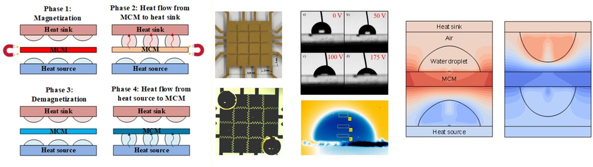 The aim of the Cool BatMan project was to establish a fundamental understanding of the dynamic thermal behavior of two physical phenomena coupled within a compact magnetocaloric cooling device. A magnetocaloric material (and the associated magnetocaloric effect) was combined with the phenomenon of electrowetting-on-dielectric (digital microfluidics), resulting in a unique magnetocaloric cooling concept that could in the future serve as a BTMS for batteries in e-mobility. During the Cool BatMan project, we developed expertise in microfabrication technologies, new characterization methods, observations of new physical phenomena and digital microfluidics (EWOD). Although digital microfluidics is well established in biochemistry and pharmaceutical applications, within this project we identified its strong potential for use in entirely different technological and scientific domains—particularly in thermal management at the mini- and microscale. The project results led to publications of 6 papers in peer-reviewed journals, among which one in Nature Communications and one in Advanced Material Interfaces. Furthermore, 30 conferences presentations were held throughout the project duration, out of which 7 were invited lectures. To summarize the most notable results of the Cool BatMan project: a) Development and investigations of thermodynamics of a novel EWOD thermal switch-capacitor coupled with MC material, b) Establishing a quality microfabrication procedure and know-how for EWOD applications, c) Establishing new characterization methods for preparation of high-emissivity black coating for infrared thermal measurements, d) First experimental investigation of demagnetizing field-induced magnetocaloric effect in gadolinium, e) Investigations of caloric effects in spin-crossover polymer composite films, f) Direct observation of magnetocaloric and electrocaloric responses on room-temperature multicaloric composite films, g) Investigations of structural and electrical properties of Al2O3/Al dielectric composites prepared by aerosol-deposition, h) Developments of novel electro-permanent magnetic field sources and a controller for magnetic energy recovery.