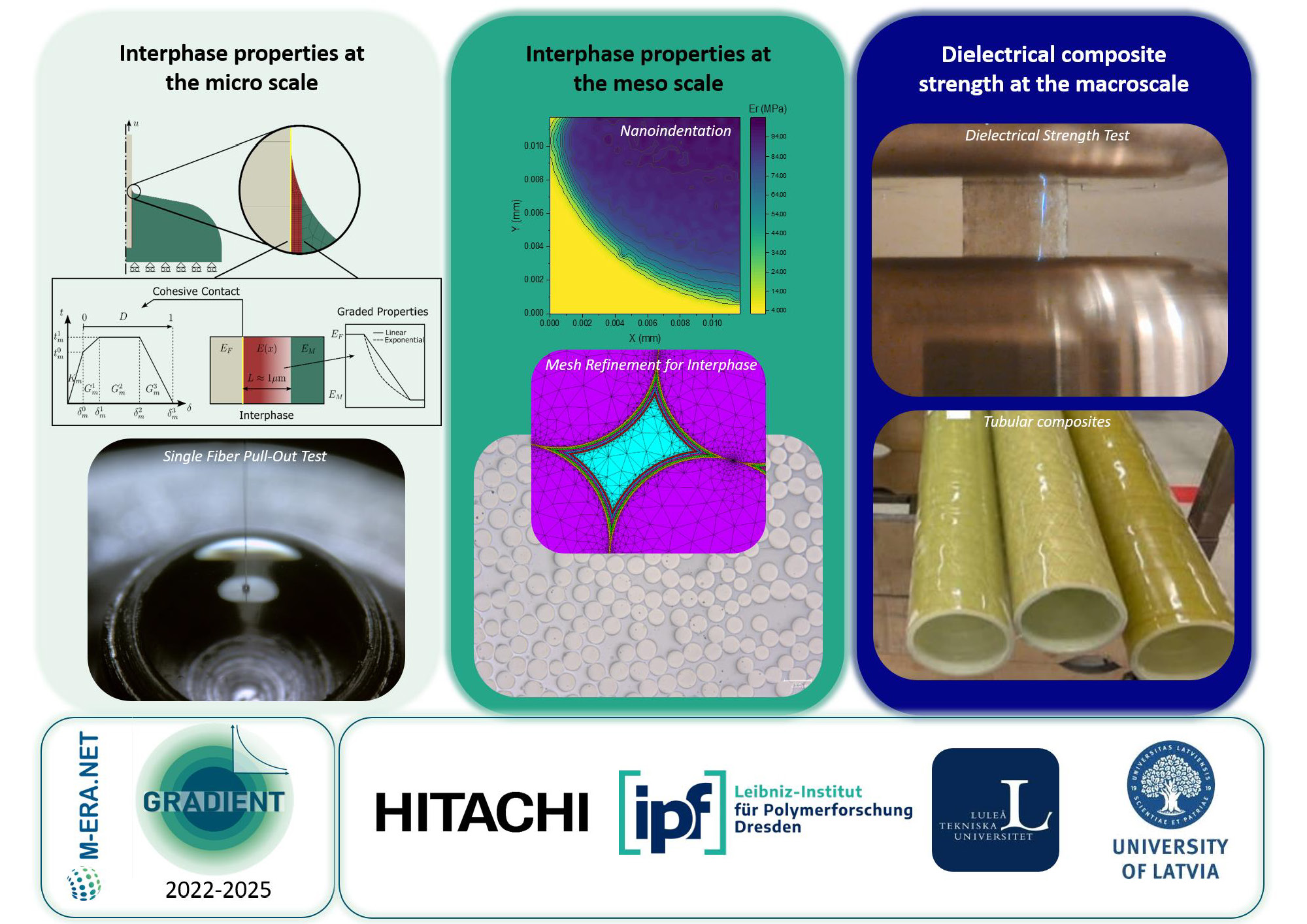 Power transformers and switchgears are key components made of high-performance composites used in power grids. Their availability and robustness have a decisive influence on the reliability and profitability, especially for the future expansion of power grids. Composites mechanical and dielectric strength is strongly influenced by the fiber-matrix interphase, the main source of micro-scale damage. The project’s objective was therefore to develop new methodologies and validation tools for interphase optimization, while also exploring approaches to reduce stress concentrations within the interphase to enhance the durability of composite structures. In this project, researchers developed and carried out experiments on several levels — from microscopic tests on single fibers to larger tests on composite plates and tubes. Tailored glass fibers (GF) were produced via a pilot spinning line, where a new approach (nanoclay sizing) was tested to optimize the interphase. In the micro-scale, interfacial shear strength was measured by single fiber pull-out (SFPO) tests. The interphase stiffness and thickness was measured and visualised by nanoindentation. A new methodology using scanning electron microscopy with energy dispersive x-ray spectroscopy (SEM/EDX) led to a faster and more feasible approach for determining interphase thickness. All techniques confirmed the presence of a graded interphase, with gradual variations in properties and chemical composition. Finite element method (FEM) simulations of the SFPO, explicitly including a graded interphase, were carried out to understand the damage process of fiber-matrix debonding and to determine corresponding mechanical parameters. A generalized variant of a traction separation law was introduced, leading to the conclusion that fiber-matrix debonding is governed by plastic deformation. At meso-scale, electrical tests revealed that breakdowns often begin near the interphase, proving its importance not only for mechanical but also for electrical performance. Further modeling confirmed that including the interphase in calculations makes predictions of material strength and stiffness much more accurate. An interactive tool (Fiber.net) was developed to predict elastic transverse properties of unidirectional (UD) composites. Finally, large-scale tests on tubular composite structures showed that overall performance depends on many factors — not just the materials themselves but also how precisely they are manufactured. This underlines why studying materials at smaller scales is so valuable: it helps identify the best combinations of fibers, coatings, and resins before production, guiding better material selection and process optimization.